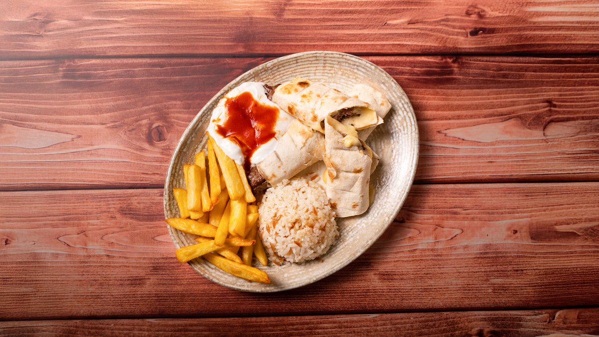 Κιμά από αρνί και μοσχάρι σε αραβική πίτα με γιαούρτι, τυρί και σαλτσα ντομάτας. Συνοδεύεται με πατάτες τηγανητές και ατζέμ πιλάφι