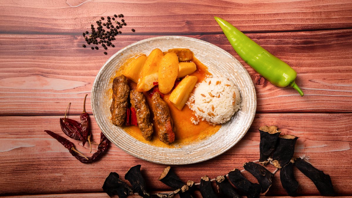 Μικρά κομματάκια μοσχαρίσιου κρέατος κοκκινιστό κατσαρόλας. Συνοδεύεται με πατάτες τηγανητές και ατζέμ πιλάφι