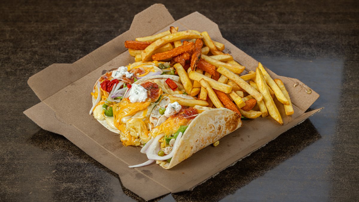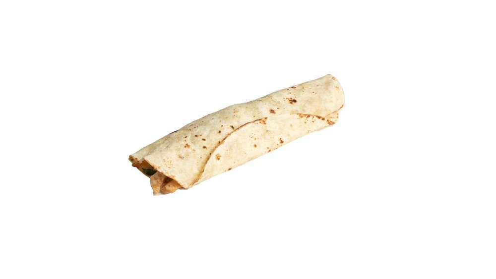 Large rolled tortilla with gouda, edam, cheddar, chopped and marinated chicken fillet, arugula, lettuce, lettuce, lola, spinach, tomato, onion, cucumber, green and red pepper, carrot, peas, corn, beans, avocado, rice, yogurt cream and fiesta sauce. Served with your choice of toppings
