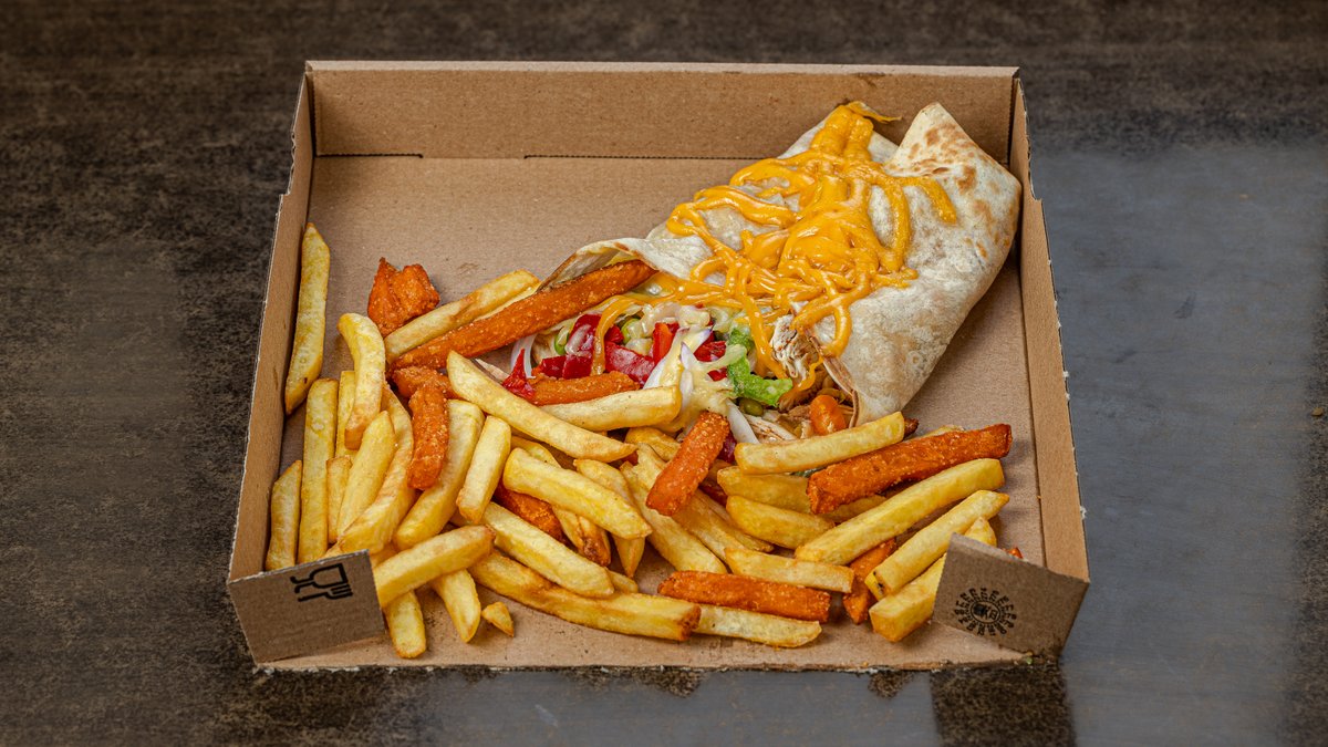 Large rolled tortilla with gouda, edam, cheddar, chicken patty, bacon, caramelized onions, arugula, lettuce, lettuce, lola, spinach, tomato, cucumber, onion, green and red pepper, carrot, peas, corn, corn, green beans, avocado, yogurt cream and BBQ sauce. Served with your choice of toppings.