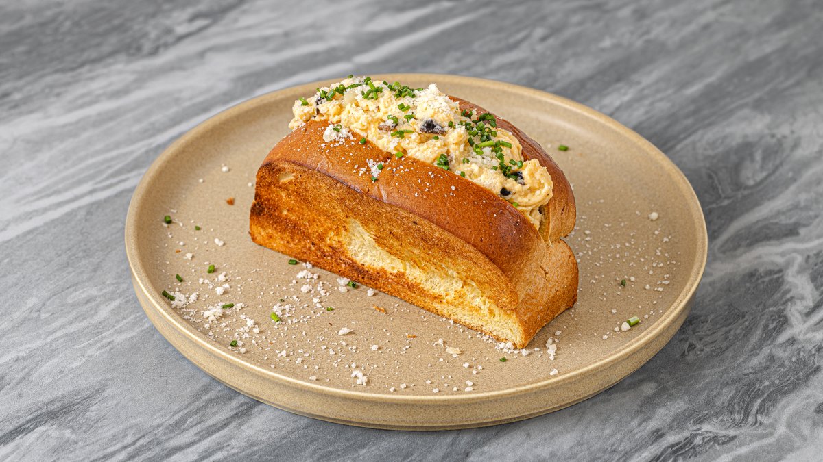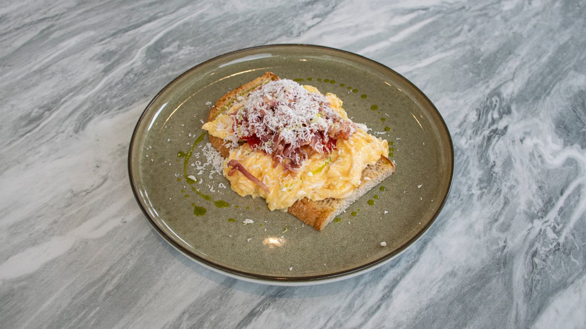 Ψωμί μπριός φρυγανισμένο, αυγά στραπατσάδα, λάδι τρούφας, μανιτάρια λευκά, παρμεζάνα, κρεμμυδάκι φρέσκο, σχοινόπρασο