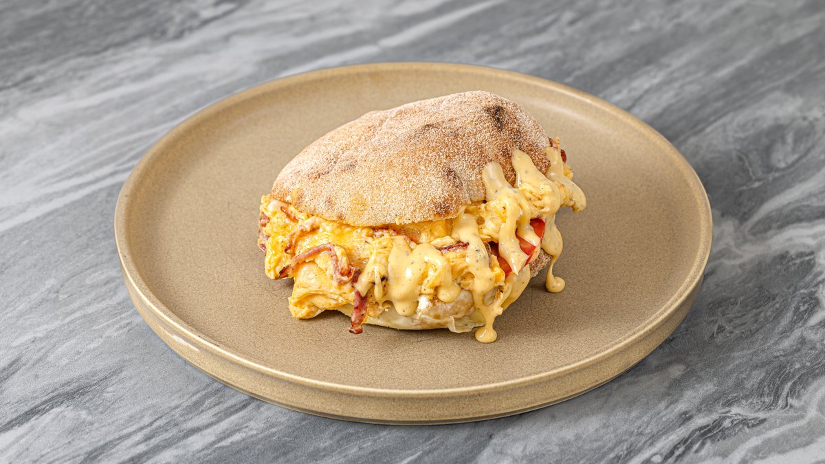Τυρί τσένταρ, μπέϊκον, αυγό τηγανιτό, σως μυρωδικών