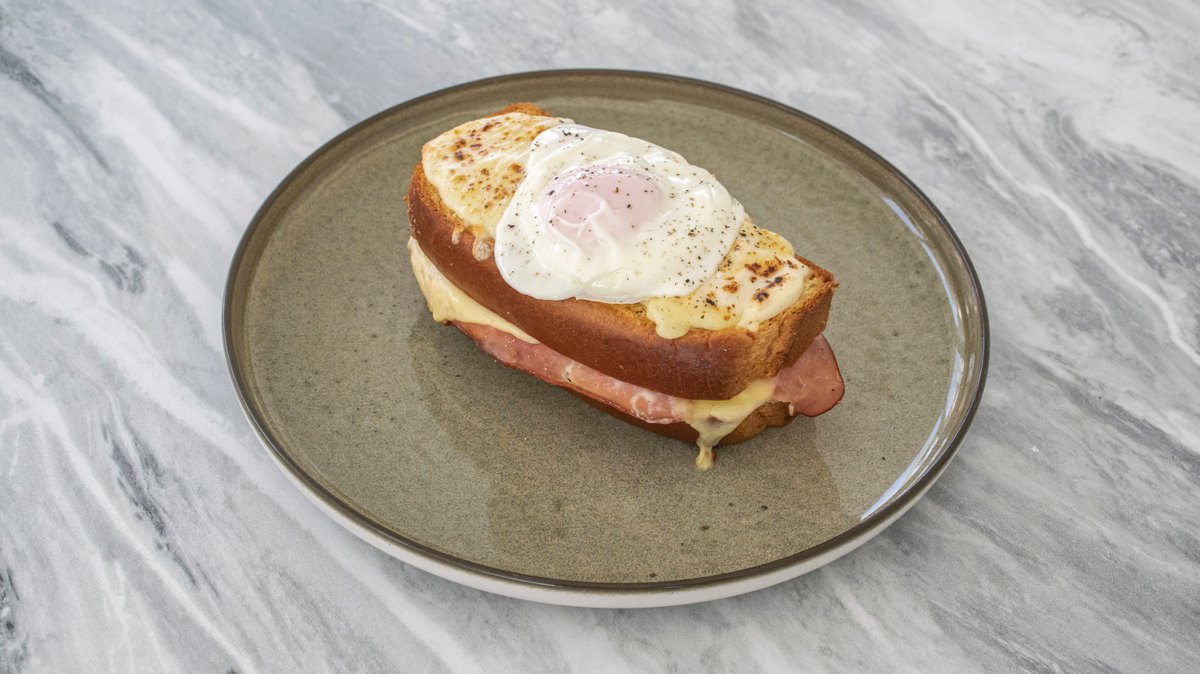 Ψωμί μπριός, μπεσαμέλ, αυγό τηγανιτό, φουαντρέ χοιρομέρι ή καπνιστή γαλοπούλα, τυρί γκούντα, φρέσκο πιπέρι