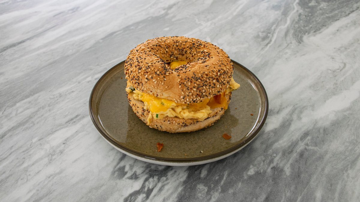 Bagel με χοιρινή ωμοπλάτη ή γαλοπούλα, τυρί γκούντα, ντομάτα σε συνδυασμό με χυμό πορτοκάλι