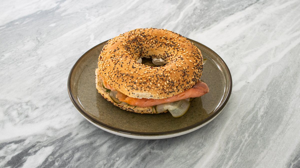 καπνιστός σολομός, κρέμα τυριού, πίκλα αγγουριού, άνηθο