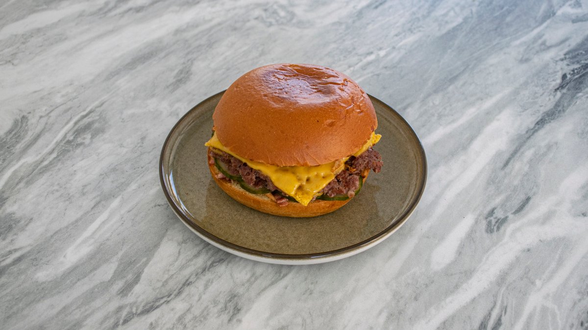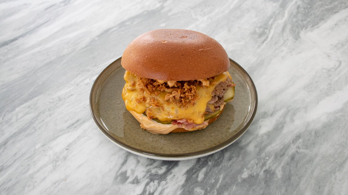 Ψωμί μπριός, διπλό 100% μοσχαρίσιο μπιφτέκι, τσένταρ, πίκλα αγγουριού, τσιπς κρεμμυδιού, bbq σως