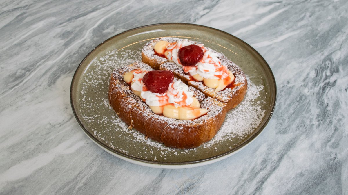 αυγόφετες με κρέμα πατισερί, κομποτέ φράουλας, ζάχαρη άχνη, σαντιγύ
