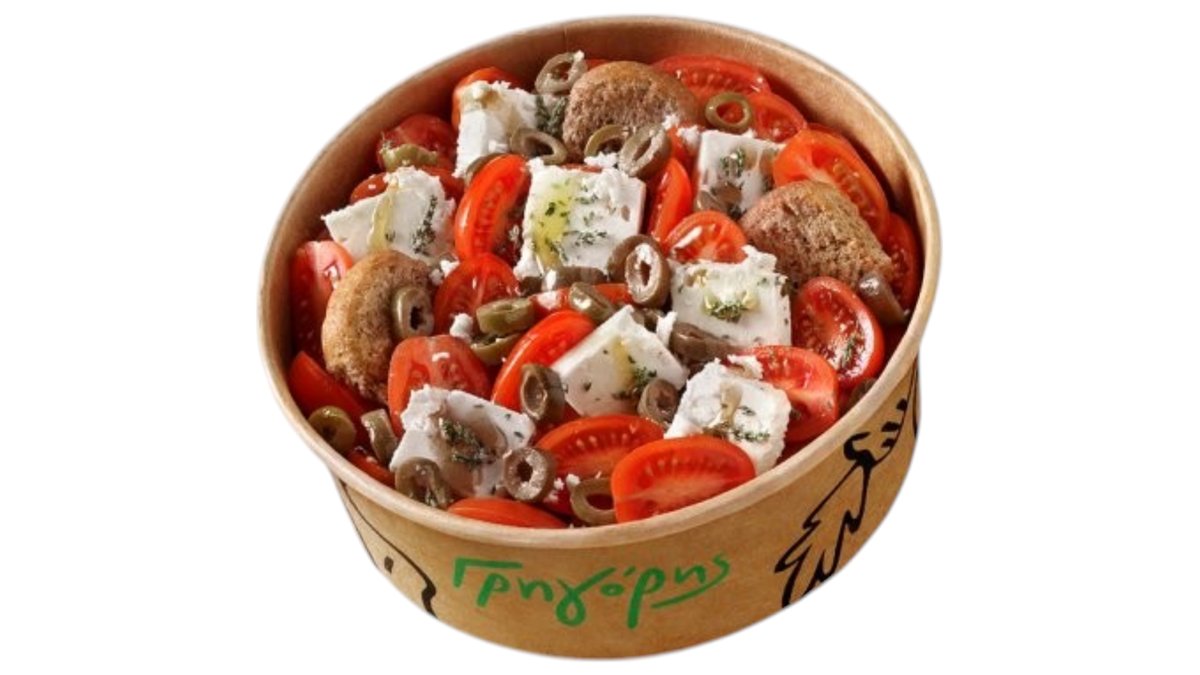 With barley nut with olive oil, cherry tomatoes, PDO feta cheese, green olives, oregano and extra virgin olive oil. With Dako, pleasure meets tradition