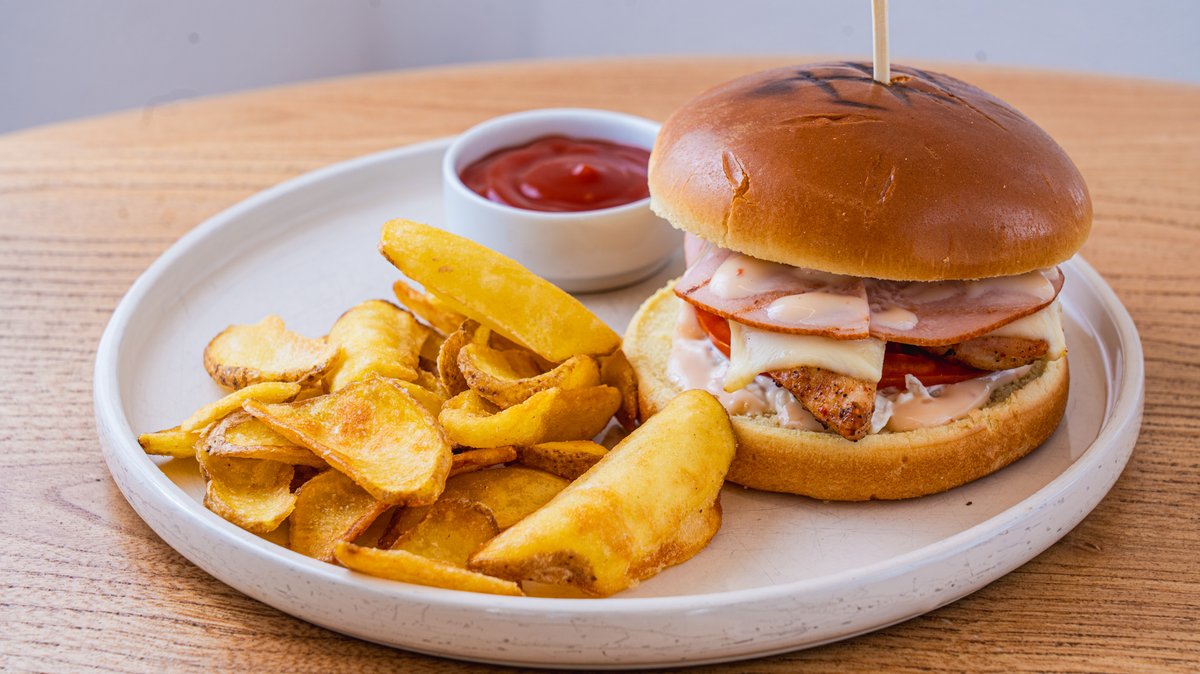 Με προζυμένιο ψωμί, καπνιστή γαλοπούλα, τυρί gouda και ντομάτα. Συνοδεύεται από πατάτες τηγανητές
