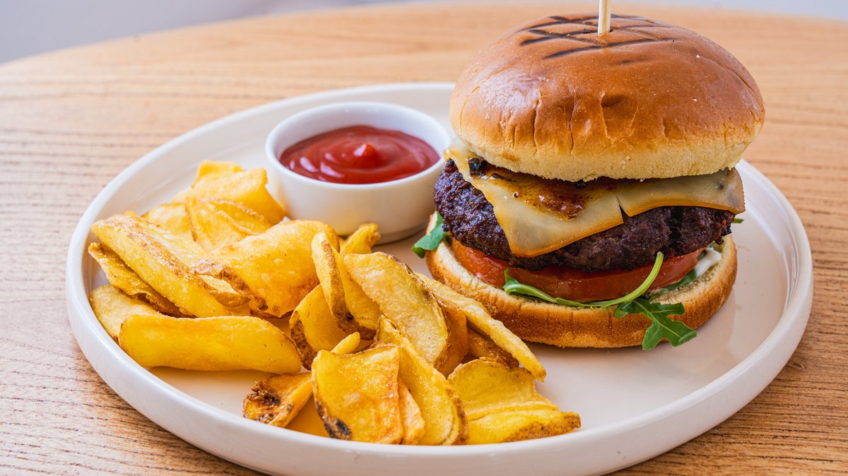 Με 200 g μοσχαρίσιο μπιφτέκι 100%, sauce tartare, μαρούλι, ντομάτα, τυρί cheddar, μπέικον, καραμελωμένο κρεμμύδι και BBQ sauce. Συνοδεύεται από πατάτες τηγανητές