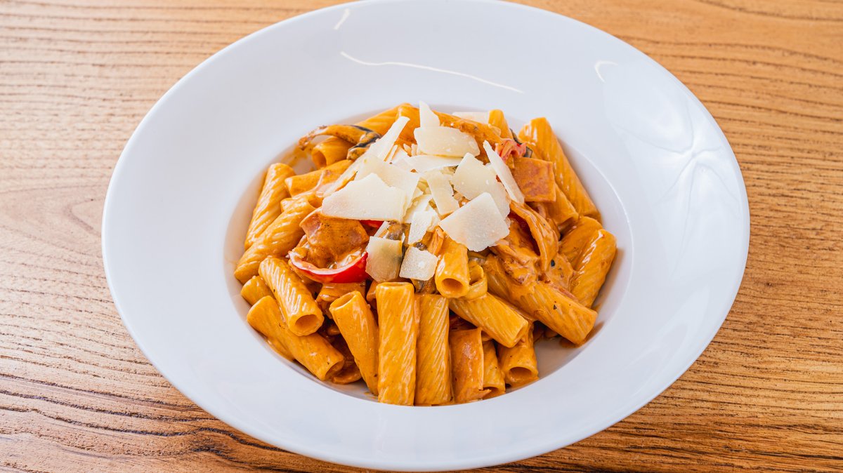 Με μπέικον, μανιτάρια, πράσινη πιπεριά, κόκκινη πιπεριά, μπούκοβο, ροζ σάλτσα, βότκα, παρμεζάνα και rigatoni