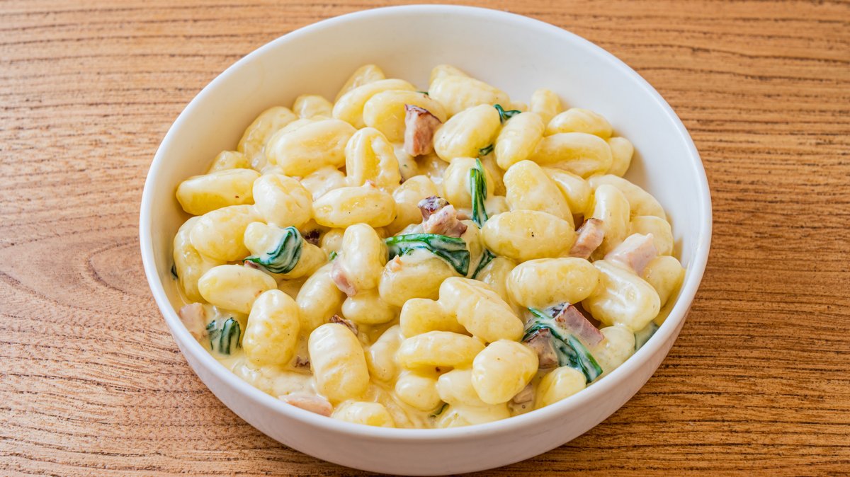 Με νιόκι πατάτας, καπνιστή πανσέτα, baby σπανάκι και κρέμα παρμεζάνας