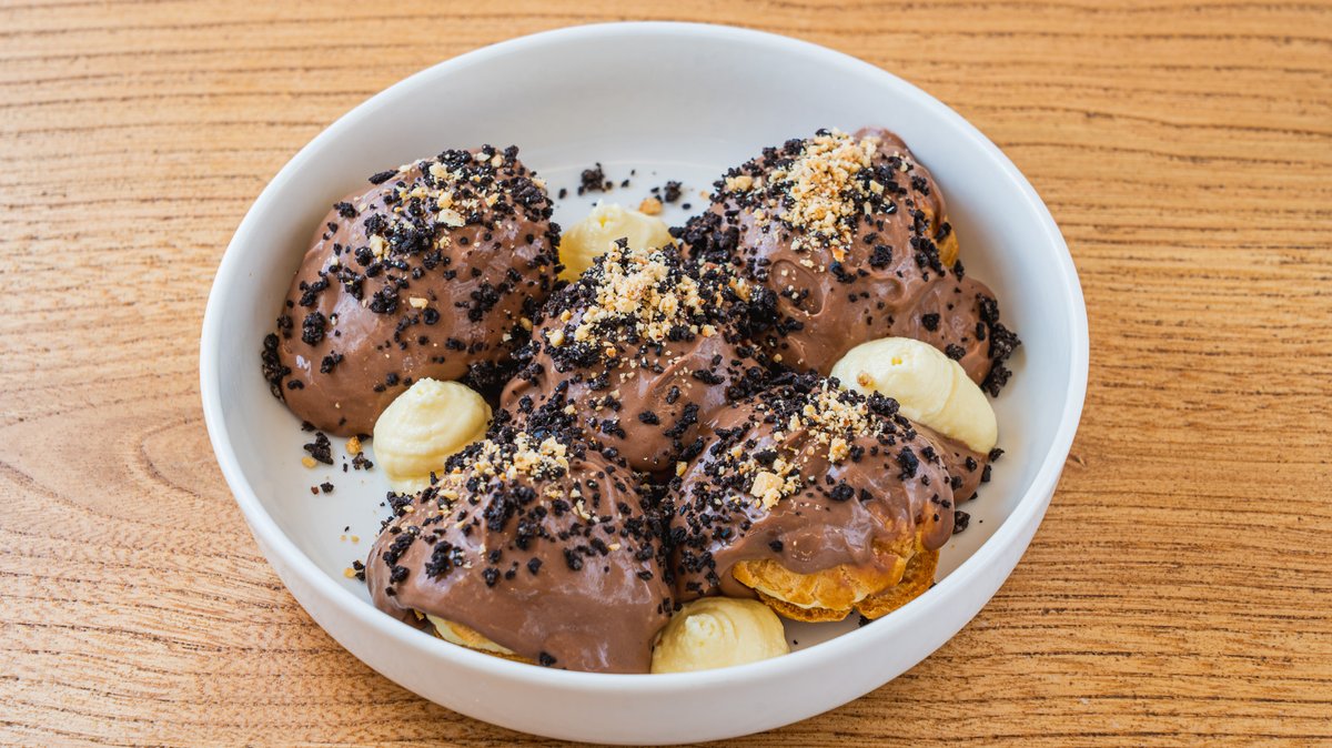 Με γεμιστά choux, κρέμα patisserie, γκανάς σοκολάτας, καραμελωμένο φουντούκι και μπισκότο Oreo