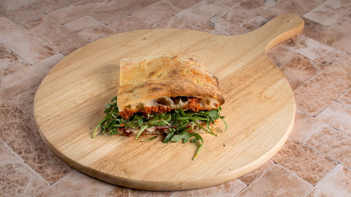 Prosciutto crudo, gorgonzola dolce, pesto λιαστής τομάτας, τομάτα, ρόκα