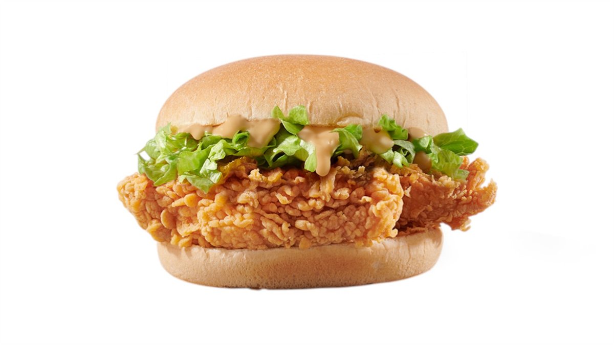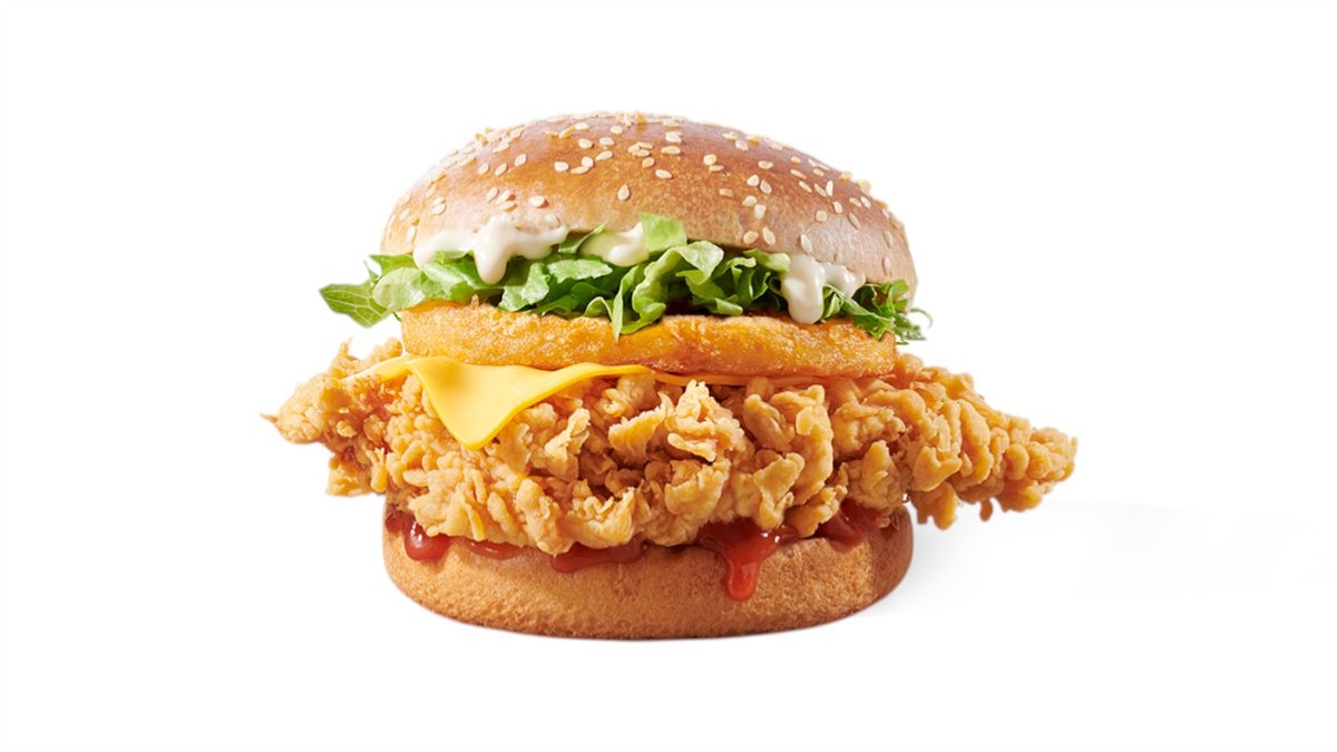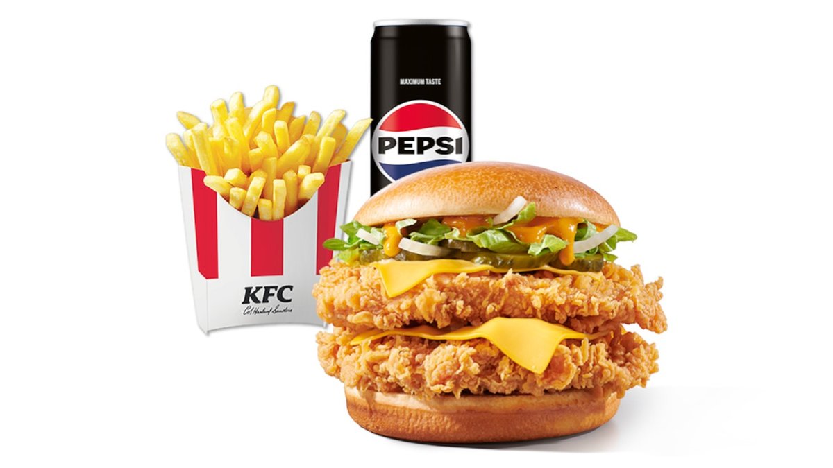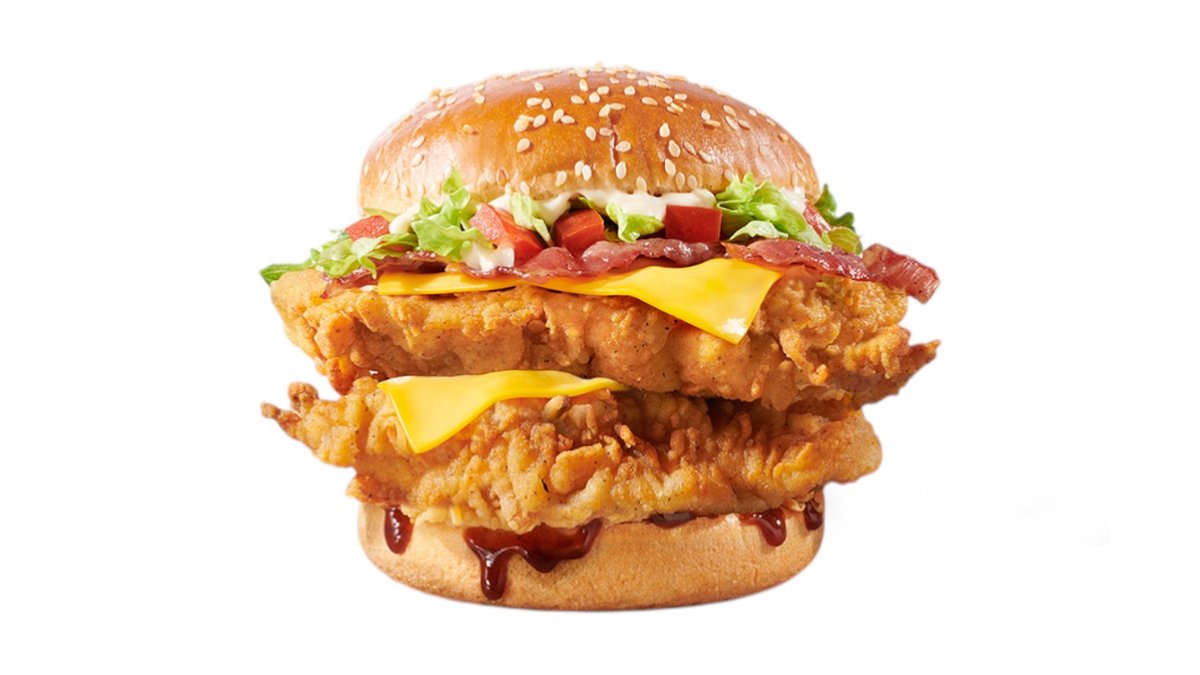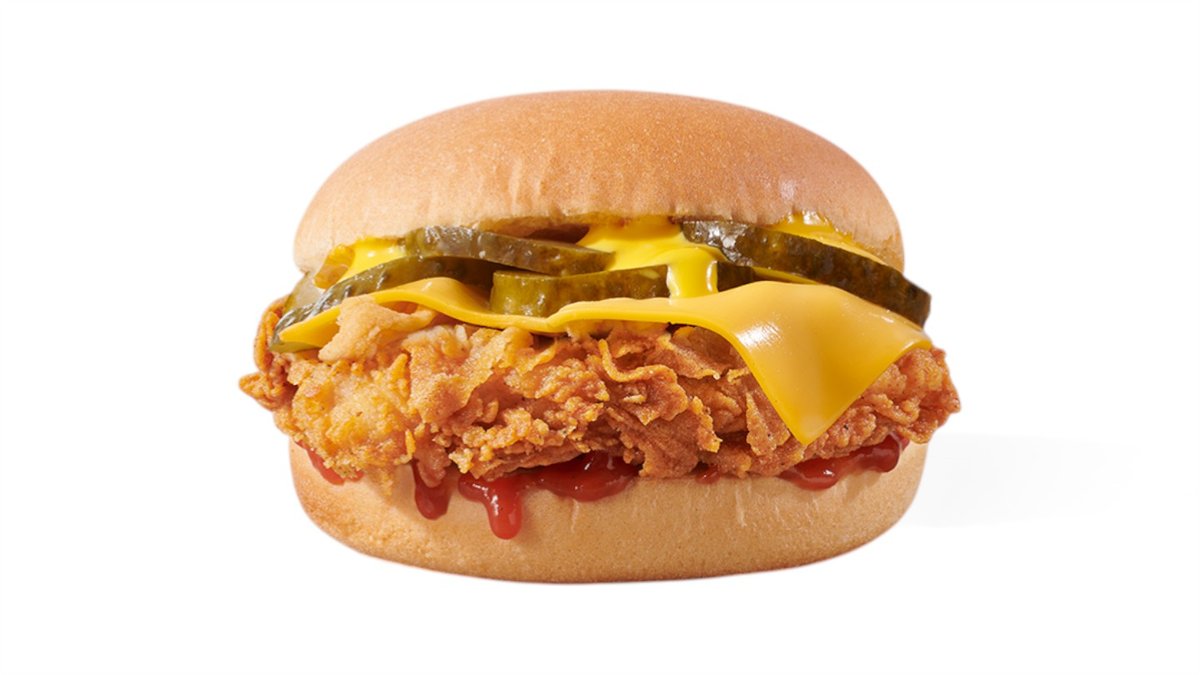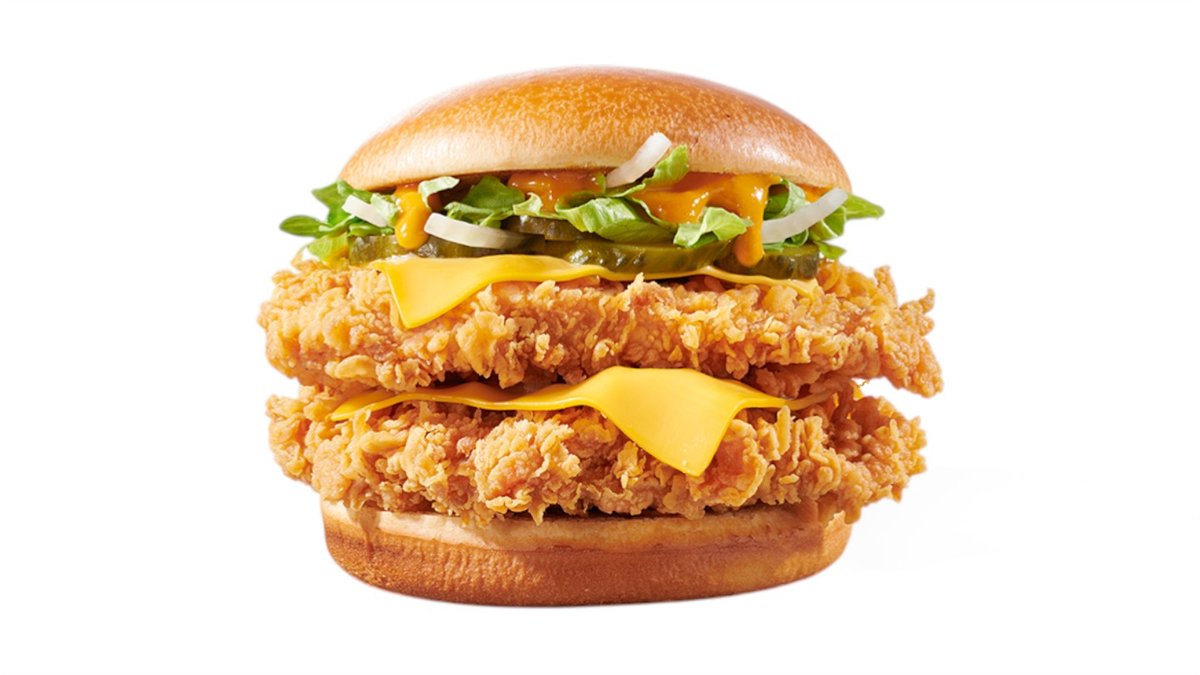 2 τραγανά ελαφρώς πικάντικα φιλετάκια (crispy strips) σε potato bun με cheddar patty, cheddar cheese sauce και big burger sauce