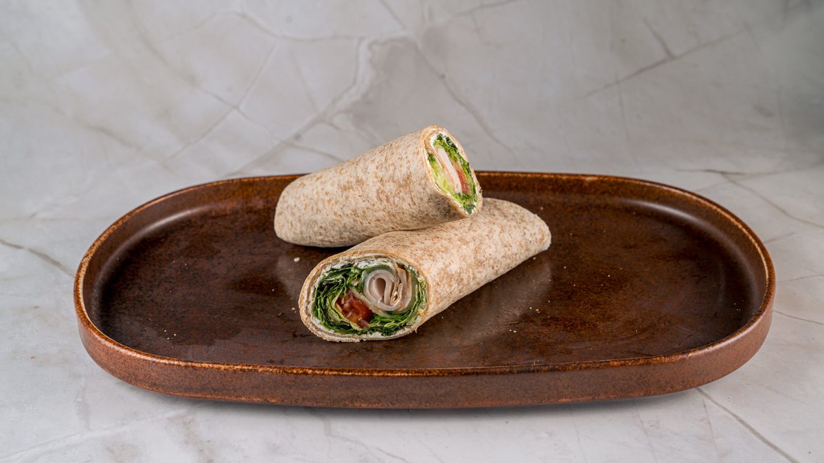 Με κρέμα τυρί, γαλοπούλα, αγγούρι, ντομάτα, φύλλα σαλάτας και dressing βαλσάμικο. Συνοδεύεται από δροσερά φύλλα σαλάτας