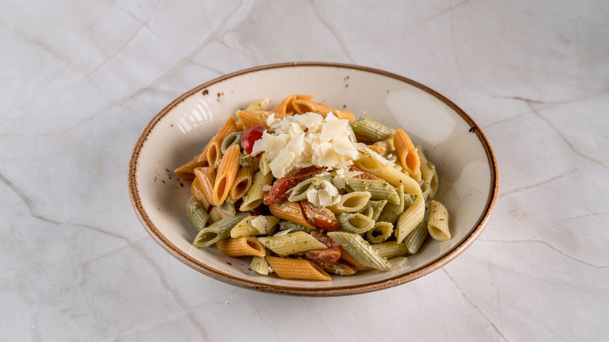 Σαλάτα με πένες τρικολόρε, ντοματίνια, παρμεζάνα και pesto βασιλικού