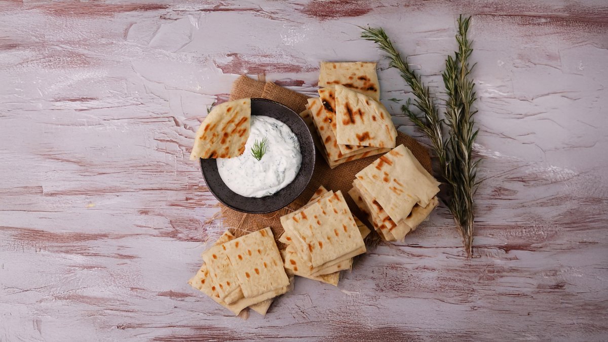 Με τζατζίκι, τομάτα, κρεμμύδι, πατάτες τηγανητές καί πιττα κομμένη