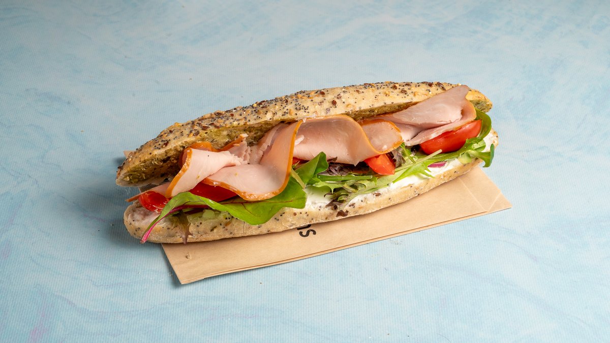 Πολύσπορη μπαγκέτα (λινάρι, κέχρι, παπαρούνα, κολοκύθα και ηλίανθος), γαλοπούλα, πέστο βασιλικού, τυρί κρέμα, ντοματίνια και ανάμεικτη σαλάτα. Επίλεξε το μέγεθος που επιθυμείς