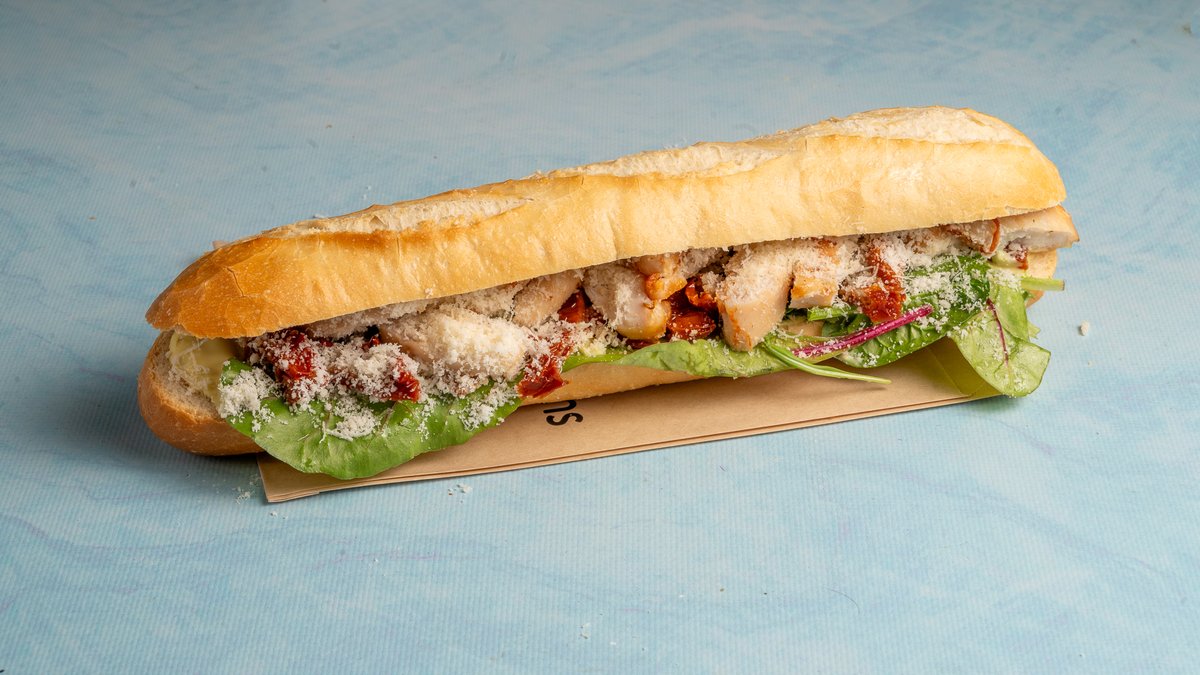 Λευκή μπακέτα, κοτόπουλο φιλέτο, λιαστή ντομάτα, παρμεζάνα, ανάμεικτη σαλάτα και σως μουστάρδας. Επίλεξε το μέγεθος που επιθυμείς