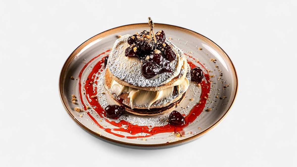 Με κρέμα βανίλιας, αγριοκέρασο, πάστα φουντουκιού με καραμέλα και ζάχαρη άχνη