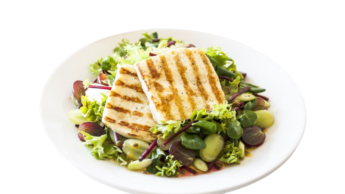 Με μαρούλι, ρόκα, λιαστή ντομάτα, ψητό χαλούμι, μπουκίτσες ψητού κοτόπουλου, σπιτικά κρουτόν και βινεγκρέτ μελιού με βαλσάμικο