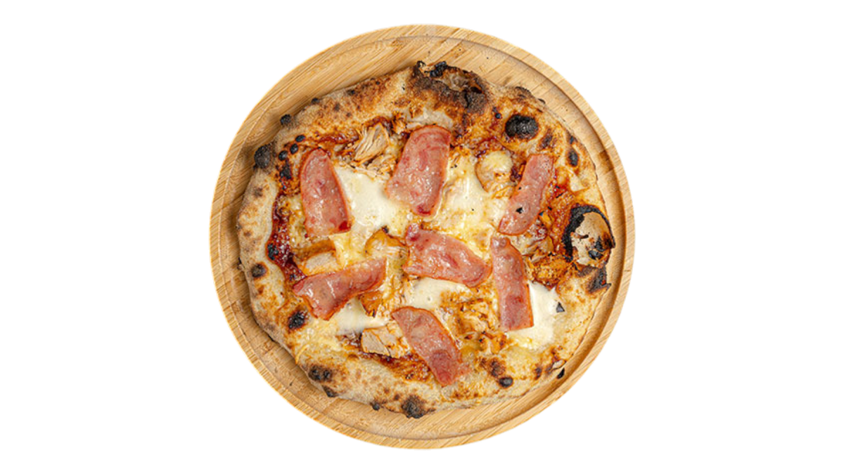 Σάλτσα ντομάτας, τυρί γκούντα, χοιρινή ωμοπλάτη, καπνιστό μπέικον, πεπερόνι, χωριάτικο λουκάνικο, φρέσκα μανιτάρια και πιπεριά