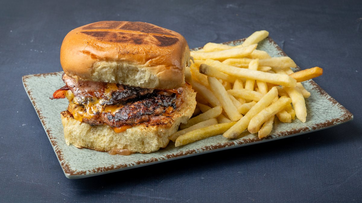 Με διπλό μπιφτέκι, τσένταρ, μπέικον, αγγουράκι πίκλα, καραμελωμένο κρεμμύδι και biggy burger sauce