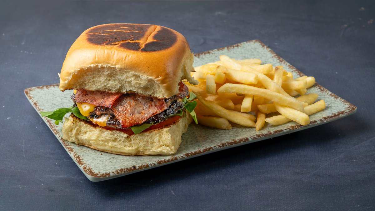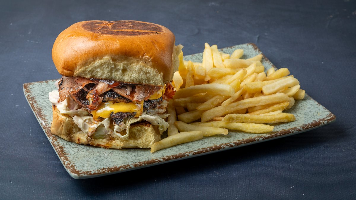 Με διπλό μπιφτέκι, τσένταρ, μπέικον, αγγουράκι πίκλα, μαγιονέζα και κέτσαπ