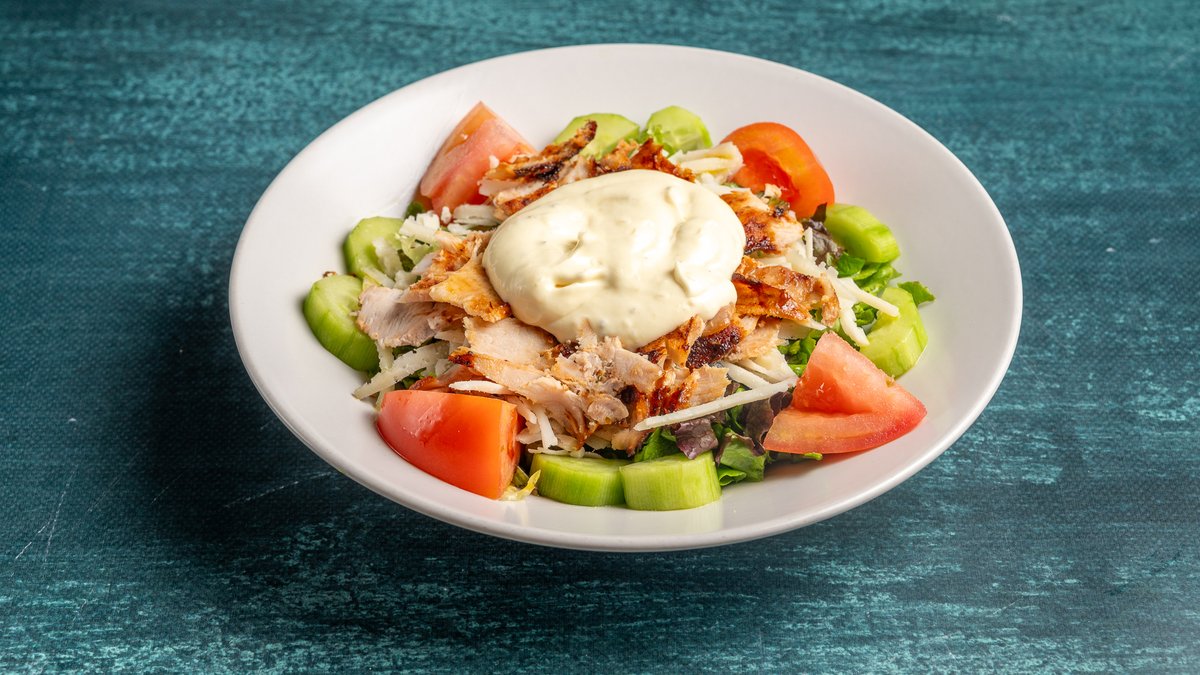 Μαρούλι, λόλα, ντομάτα, αγγούρι παρμεζάνα, γύρος κοτόπουλο, σως μουστάρδας