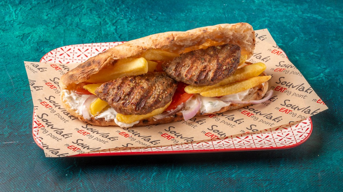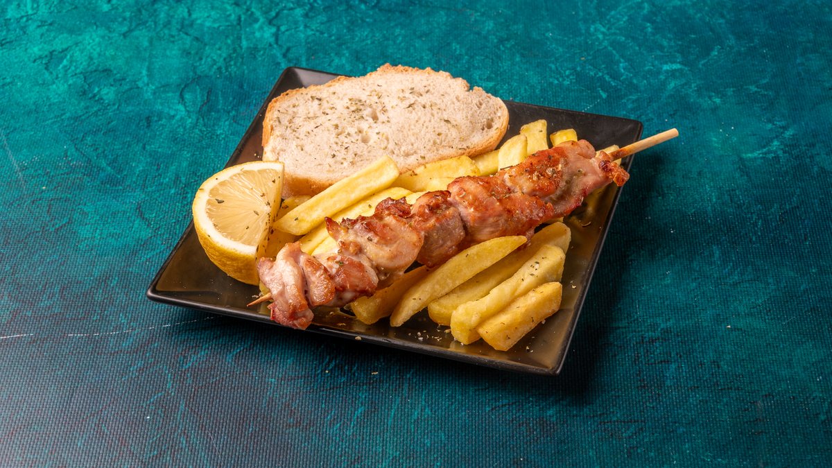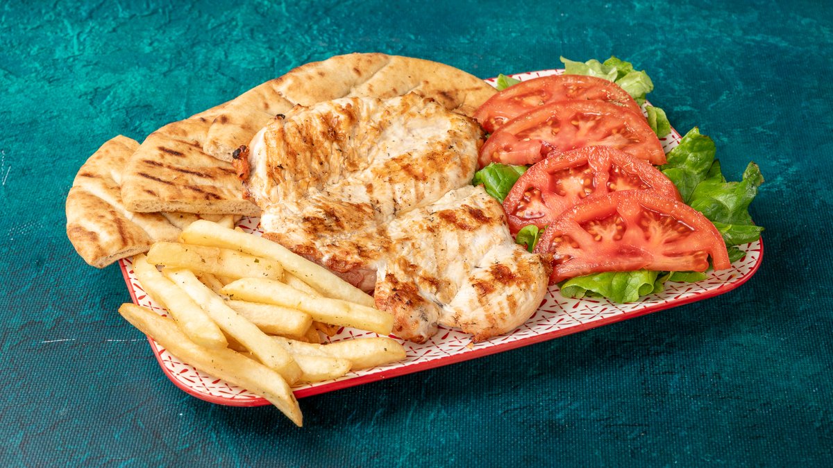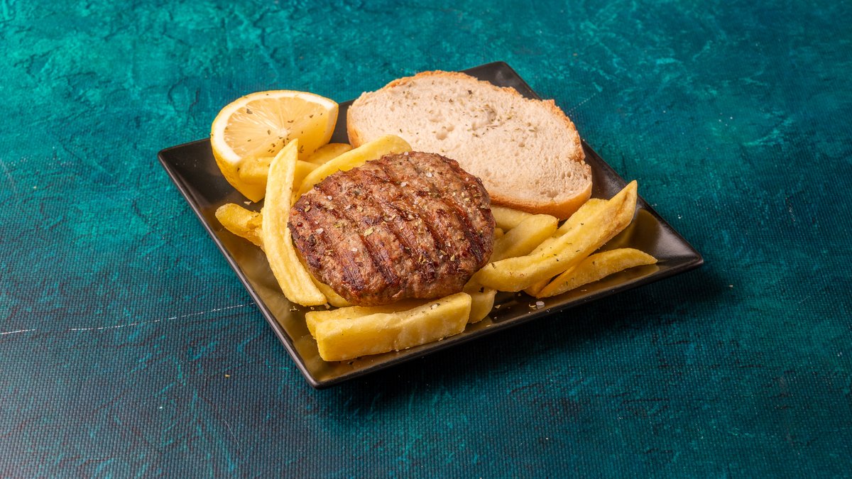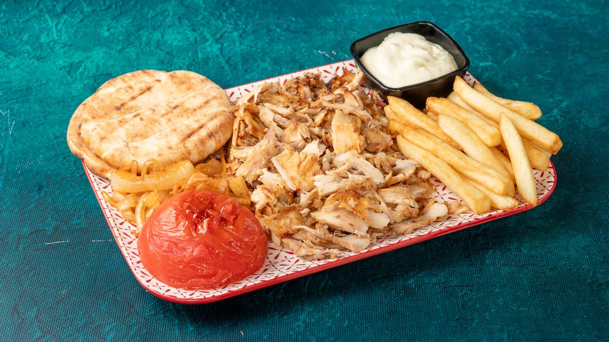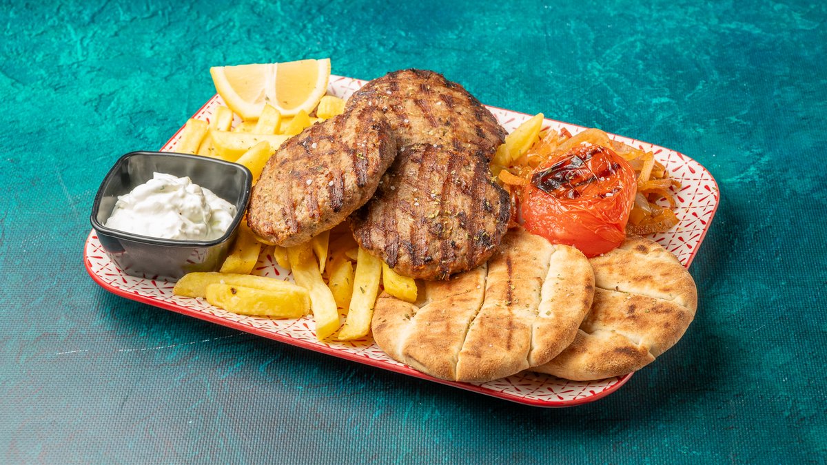 Συνοδεύεται από πατάτες τηγανητές, ντομάτα ψητή, κρεμμύδι ψητό, 2 πιτάκια μίνι και σως