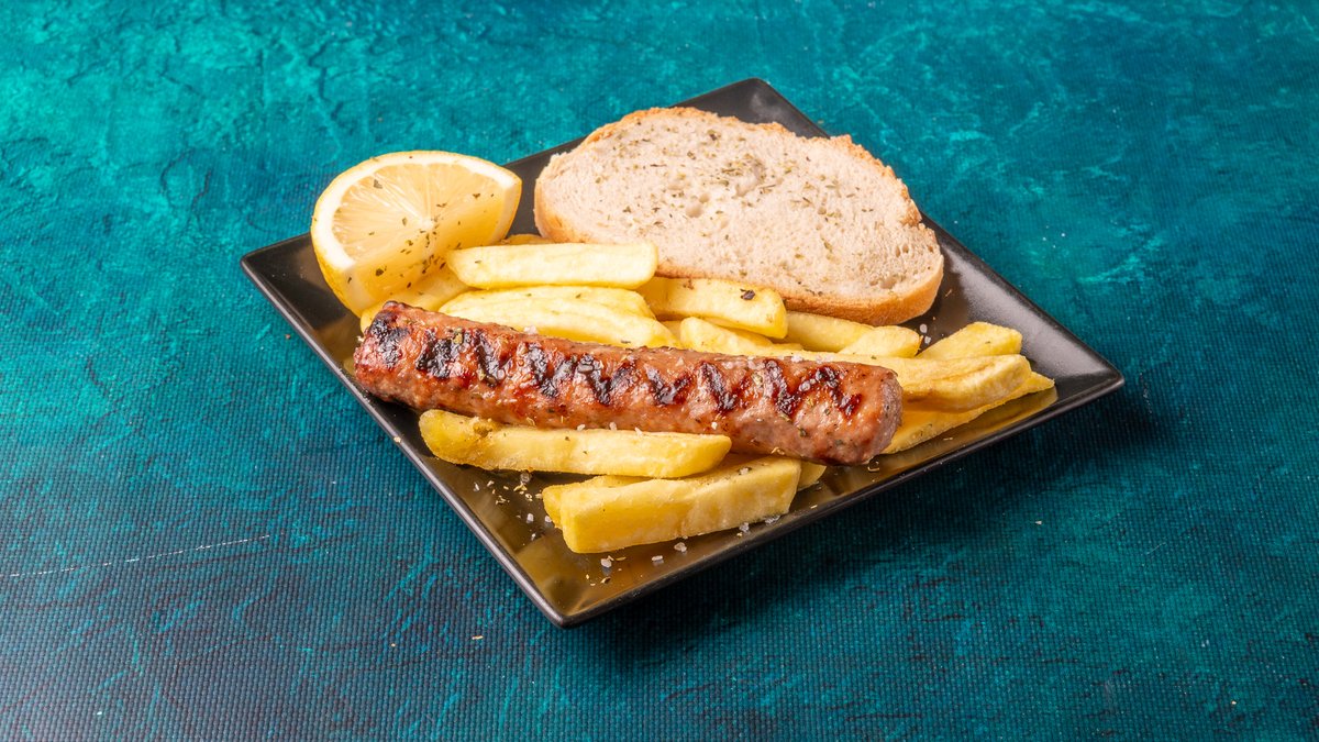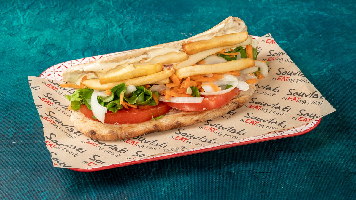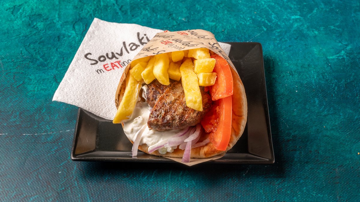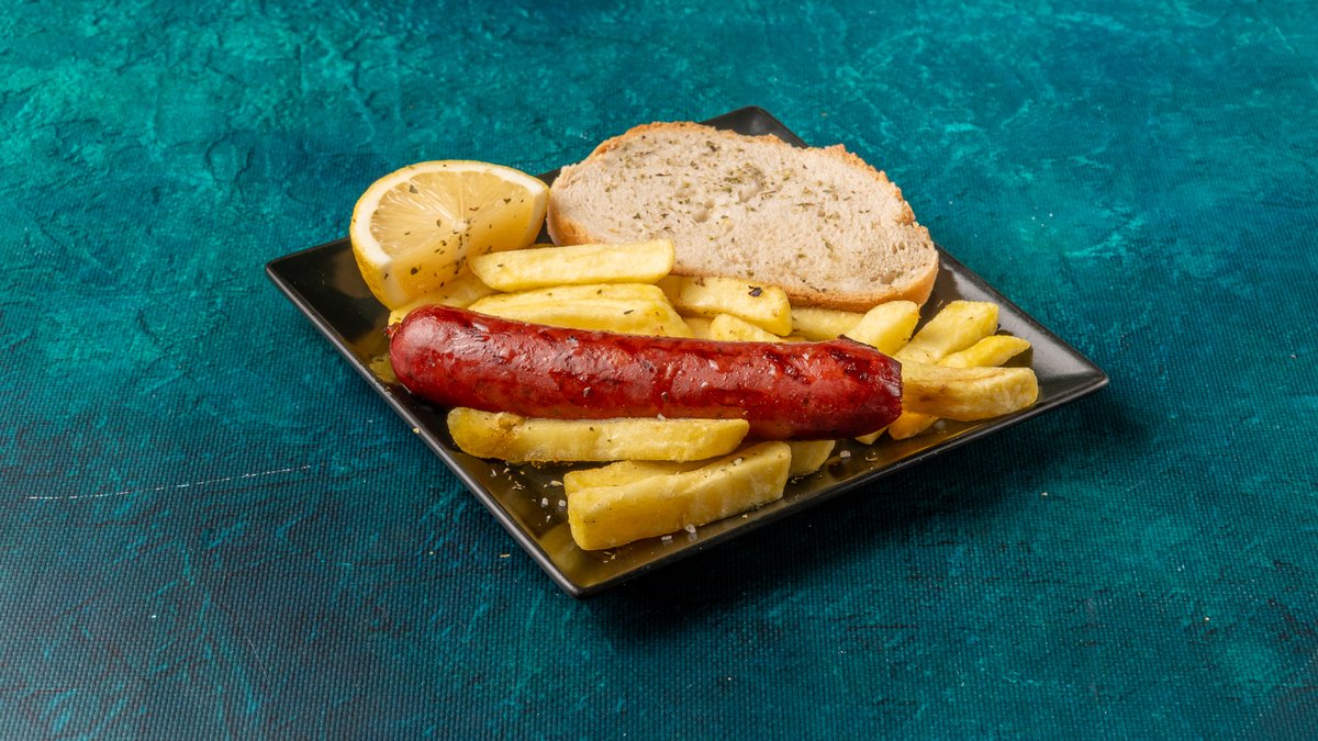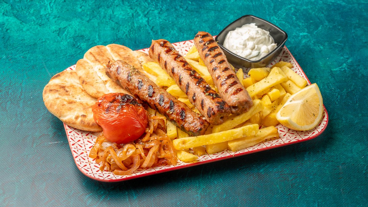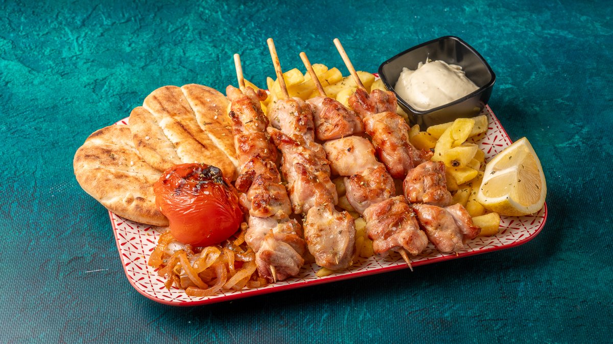 Συνοδεύεται από πατάτες τηγανητές, ντομάτα ψητή, κρεμμύδι ψητό, 2 πιτάκια μίνι και σως