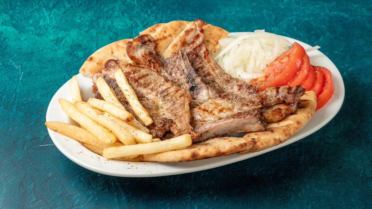 3 Τεμάχια. Συνοδεύεται από πατάτες τηγανητές, ντομάτα ψητή, κρεμμύδι ψητό, 2 πιτάκια μίνι και σως