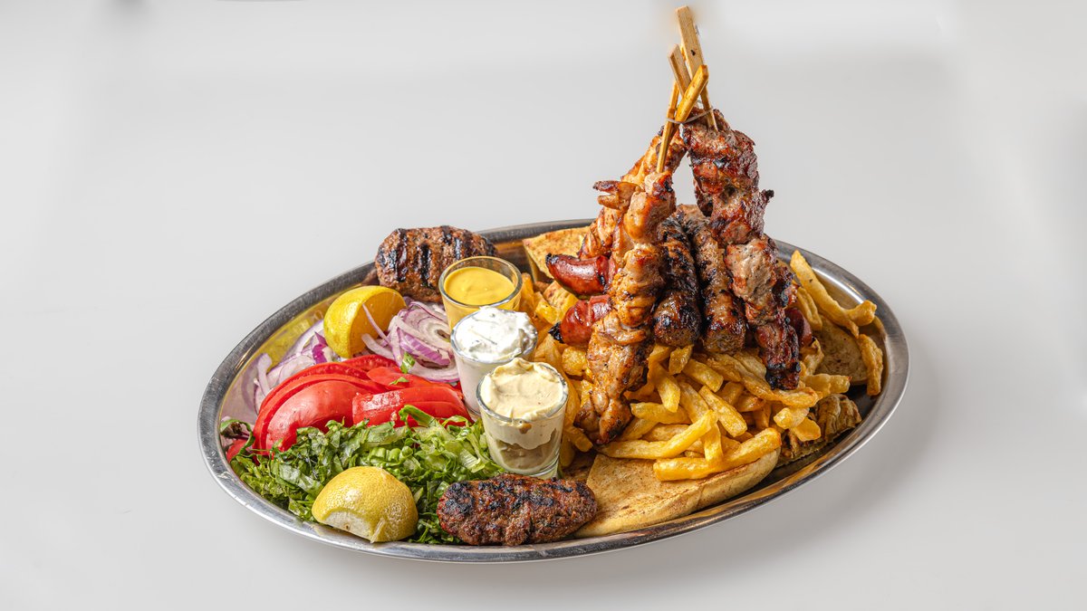 1 καλαμάκι χοιρινό, 1 καλαμάκι κοτόπουλο, 1 μπιφτέκι, 1 κεμπάπ, 1 λουκάνικο, γύρος χοιρινός, πατάτες τηγανητές και πίτα κομμένη