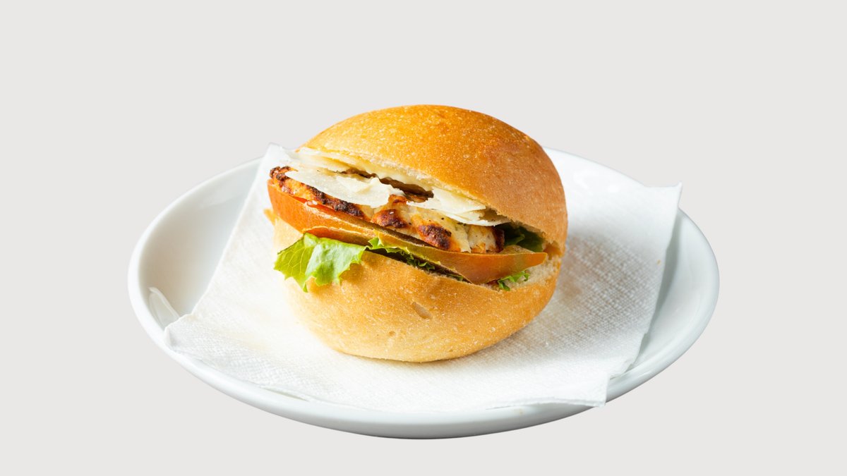Με τυρί γκούντα, φιλέτο κοτόπουλο, ντομάτα, μαρούλι και caesar sauce