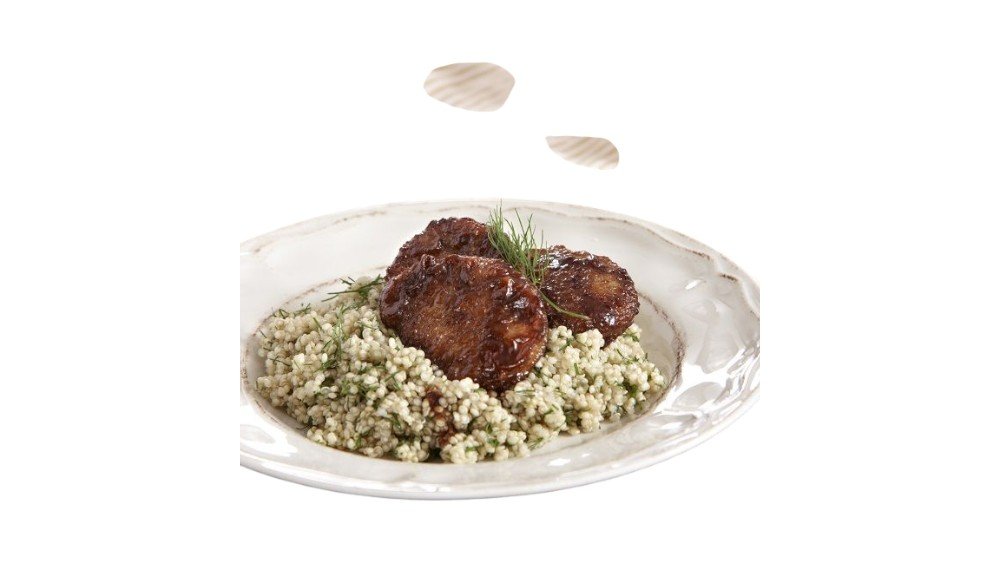 Αργοψημένη χοιρινή πανσέτα, μαριναρισμένη με μέλι και θυμάρι, μουστάρδα, θυμάρι και αρωματικά βότανα, σερβίρεται με ψητά λαχανικά και μαρμελάδα από ντομάτα