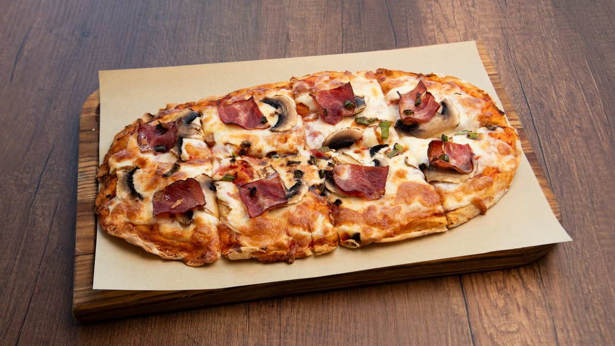 Pinsa με σάλτσα ντομάτας, mozzarella – gouda, ζαμπόν, μπέικον, πιπεριά και μανιτάρια