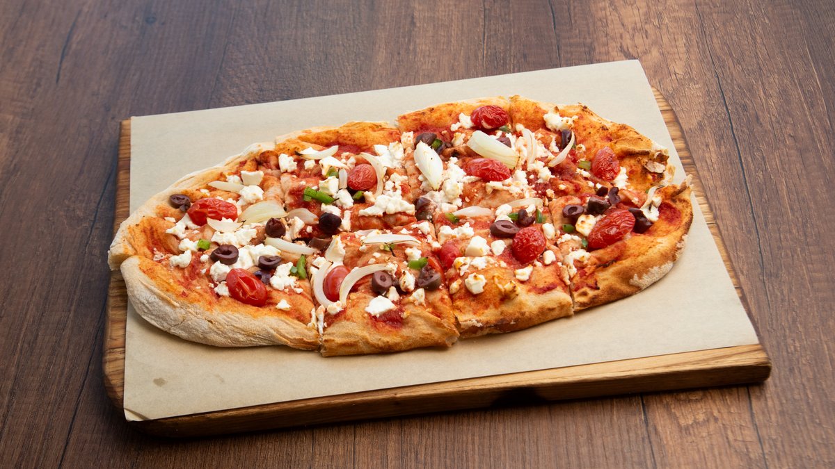 Pinsa με σάλτσα ντομάτας, φέτα, ελιές, κρεμμύδι, φρέσκια ντομάτα, πράσινη πιπεριά, ρίγανη