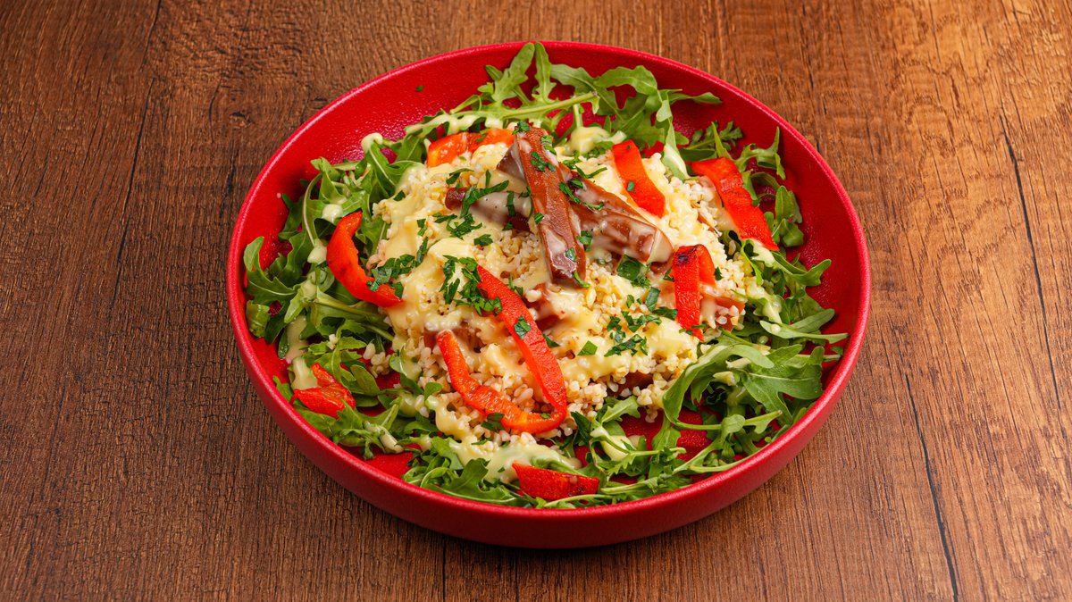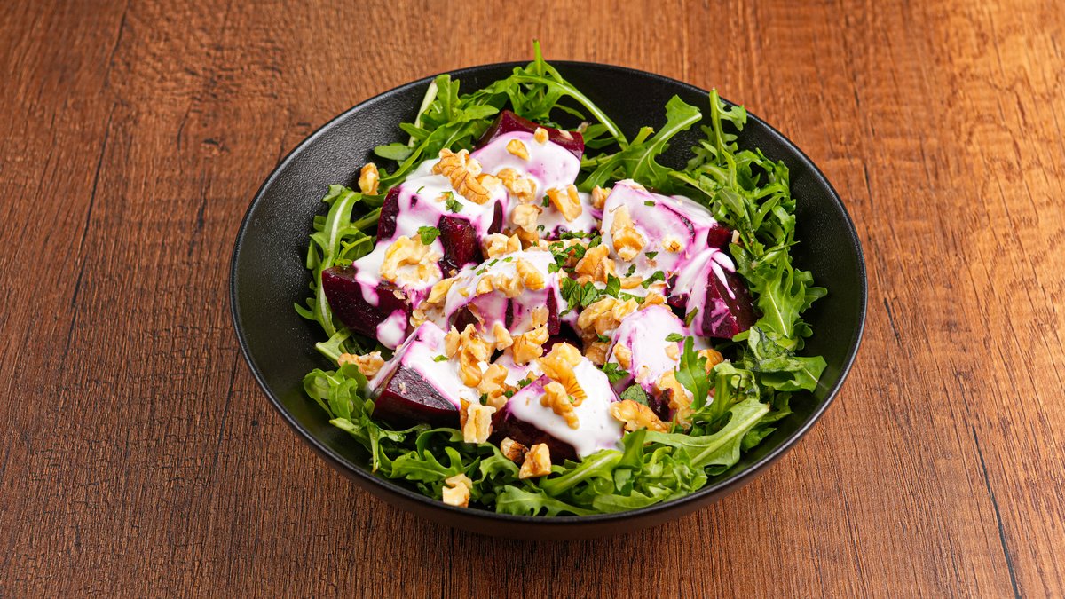 Παντζάρι, baby ρόκα, sauce γιαουρτιού με κύμινο και σκόρδο, καρύδια και δυόσμος