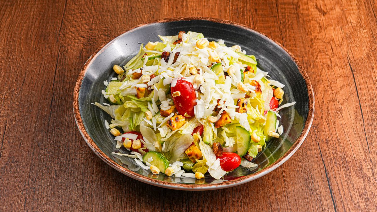 Φύλλα σπανάκι και άλλα baby φύλλα, ψητή γλυκοπατάτα, μανούρι, σαλάμι σύκου, σπασμένο παστέλι, dressing βαλσάμικου