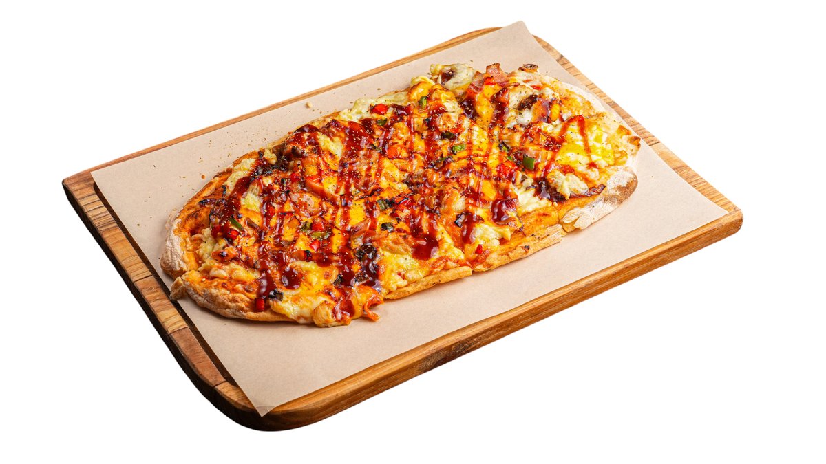 Pinsa με σάλτσα ντομάτας, κοτόπουλο, mozzarella – gouda, cheddar, μπέικον, κρεμμύδι, πιπεριά, sauce BBQ