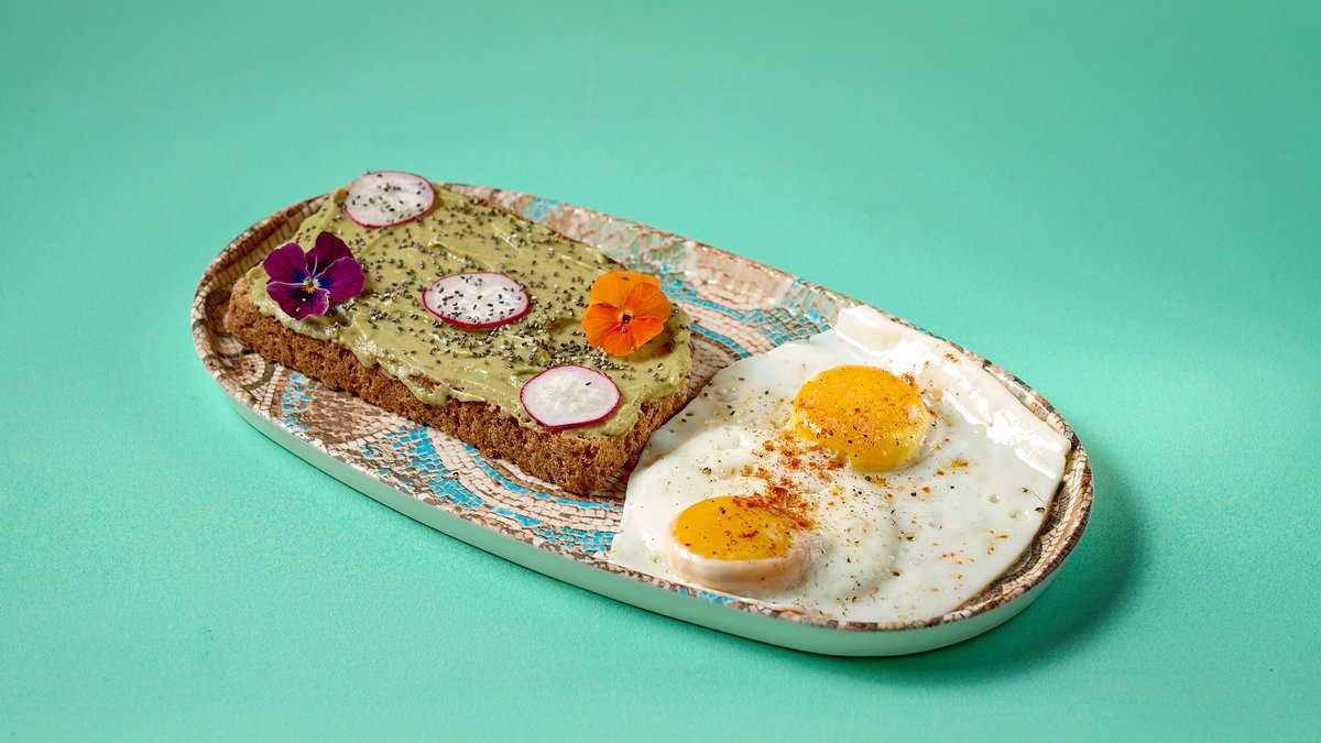 With guacamole, radish, and chia seeds. With your choice of eggs: poached, fried, or scrambled