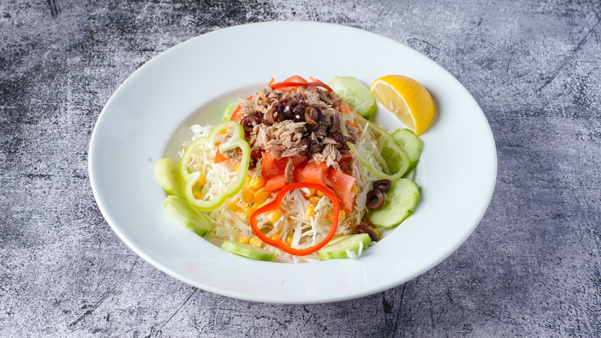Σαλάτα με λάχανο, καρότο, αγγούρι, καλαμπόκι, πράσινη και κόκκινη πιπεριά, τόνο, ελιές, λεμόνι και ελαιόλαδο