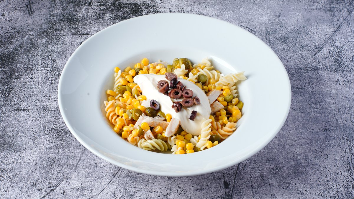 Σαλάτα με κοτόπουλο, ζυμαρικά, πίκλες, καλαμπόκι, ελιές και σως