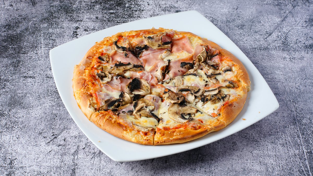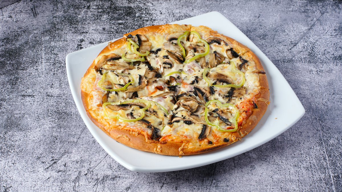 Με gouda, σάλτσα ντομάτας, ζαμπόν, μπέικον, φρέσκα μανιτάρια & πράσινη πιπεριά