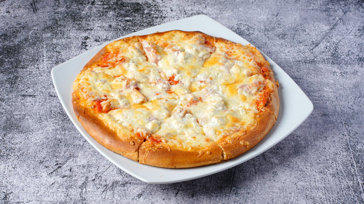 Με gouda, σάλτσα ντομάτας, κοτόπουλο, μπέικον και φρέσκια ντομάτα