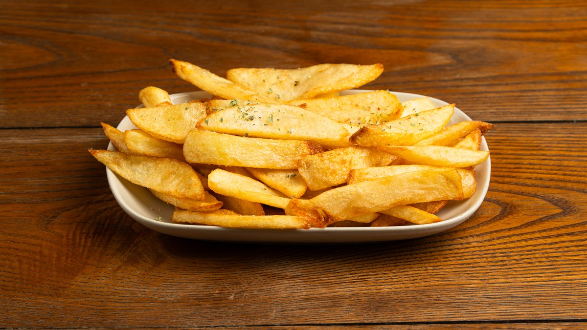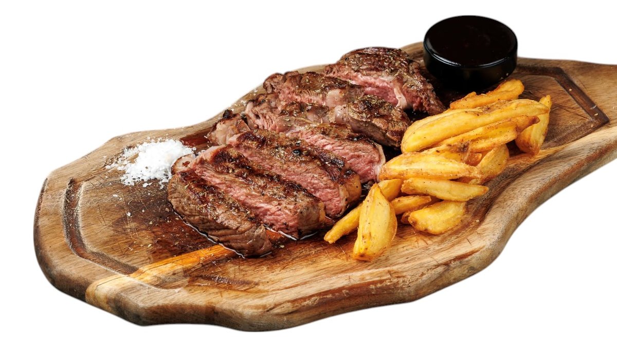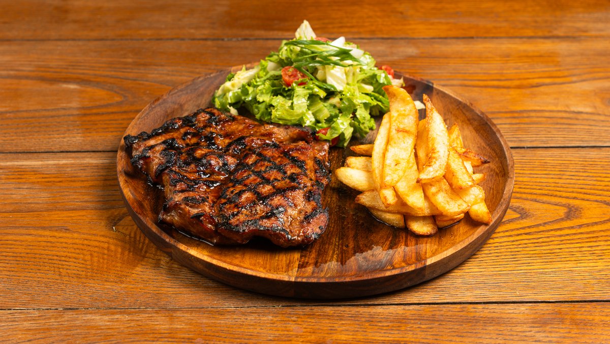Μοσχαρίσιο μπιφτέκι με δύο σως και φρέσκιες τηγανητές πατάτες και σαλάτα