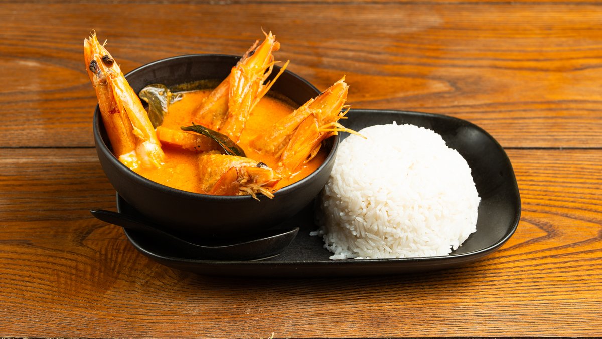 Ταυλανδέζικο κόκκινο κάρυ με γαρίδες. Σερβίρεται με αρωματικό ρύζι