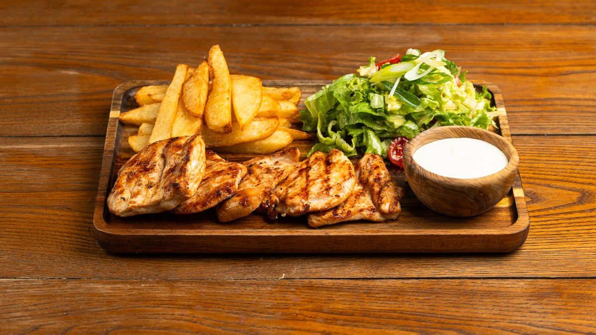 Φιλέτο κοτόπουλο στη σχάρα σερβιρισμένο με φρέσκες τηγανητές και πατάτες σαλάτα