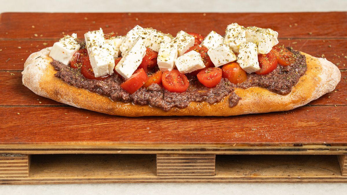 With handmade olive paste, cherry tomatoes, feta cheese and oregano